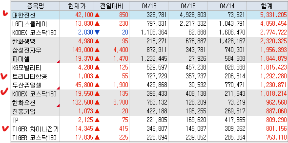 매도 : 기아 코소모신소재 호텔신라 한화솔루션 대한광통신(+136.42%) 신성이엔지(+105.45%) 롯데관광호텔 우리기술 두산에너빌리티 폴라리스오피스 에스엠 기가레인 한전기술 한국정보인증 미코(+35.08%) 빛과전자(+129.90%) 아바코 상아프론테크휴림로봇 엠씨넥스 KODEX증권 우진 로보티즈 셀바스AI 오이솔루션 아톤(+31.46%) 하이젠알엔엠 클래시스 티앤알바이오팹 이녹스첨단소재 레이크머티리얼즈 에이치브이엠 SK바이오팜 뉴로메카 디어유 카카오페이 코난테크놀리지 엔젤로보틱스 KODEX미국AI테크TOP10타겟커버드콜