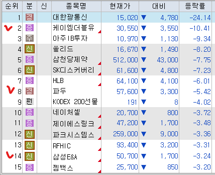 <시총 1조 원 이상 등락률 상위 종목>