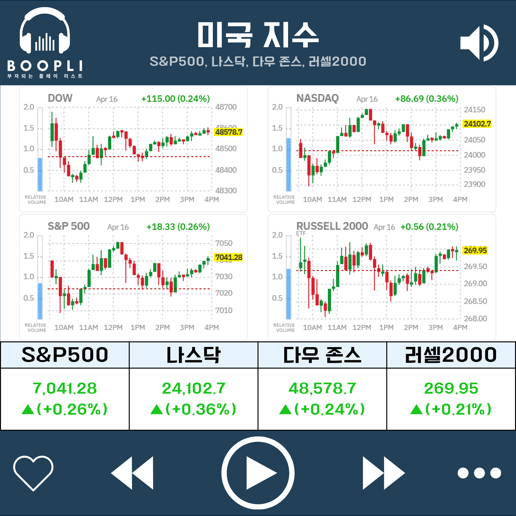 전일 미국 증시는 이스라엘-레바논 휴전 합의와 미-이란 종전 협상 기대감 속에 실적 시즌 기대와 반도체 업황 호조가 맞물리며, 다우(+0.24%), S&P500(+0.26%), 나스닥(+0.36%), 러셀2000(+0.21%) 등 4대 지수 모두 강보합으로 마감