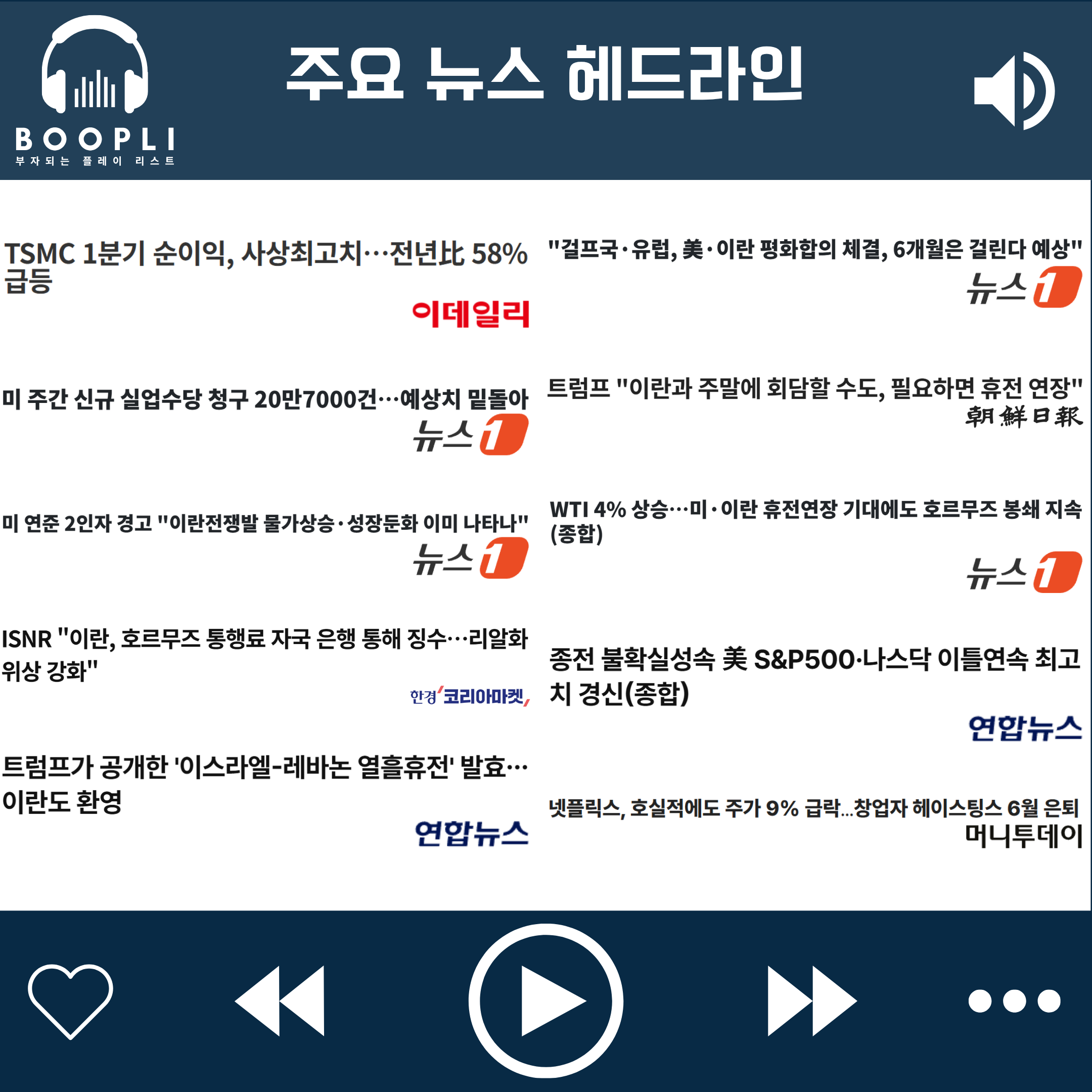 장중에는 트럼프 대통령이 이스라엘과 레바논의 열흘간 휴전 합의를 직접 발표하자 투자 심리가 빠르게 회복되며 주요 지수 모두 상승 전환