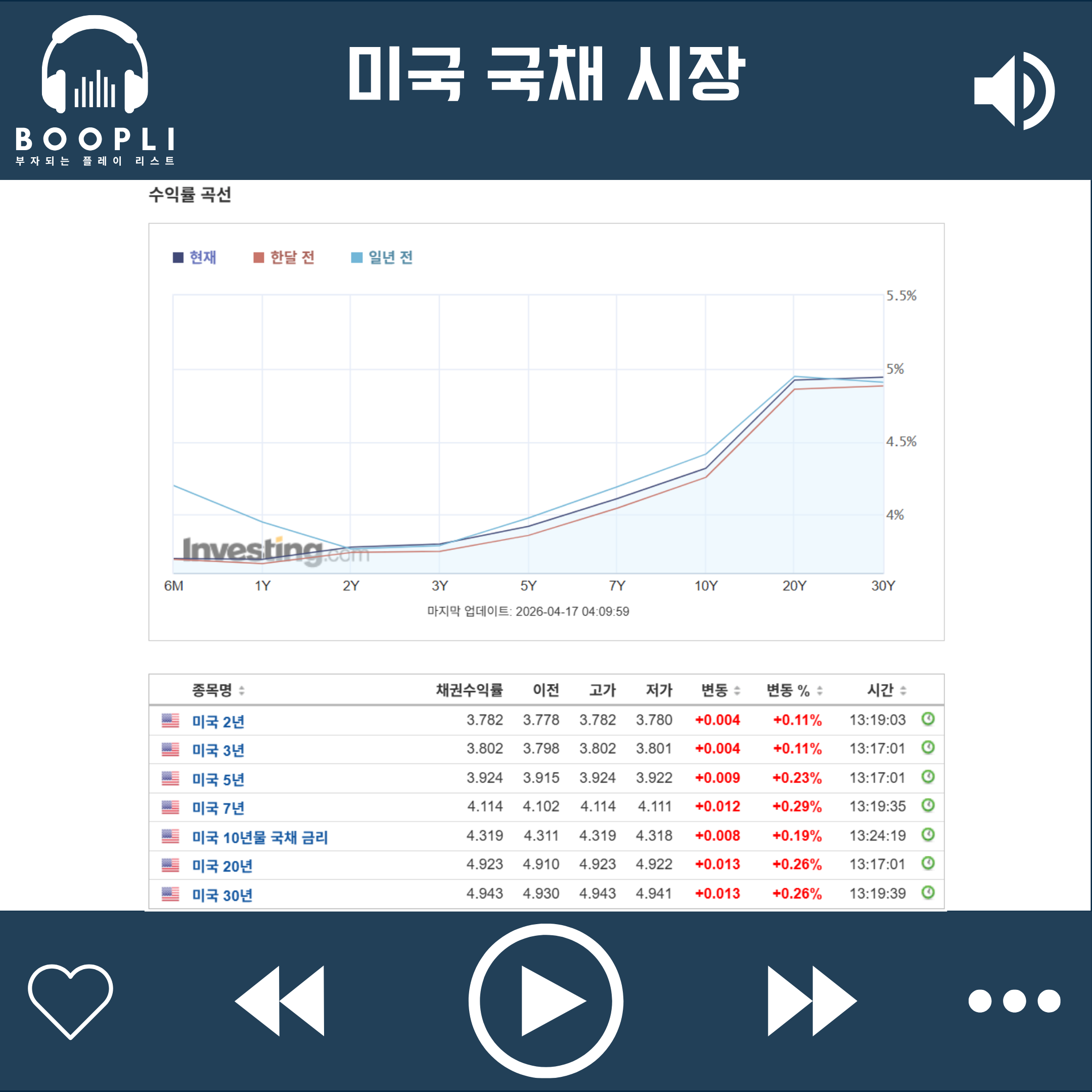 미국 국채는 이스라엘-레바논 10일 휴전, 미국-이란 종전 협상 기대감에도 불구하고 이란의 호르무즈 해협 통행료 부과 추진과 걸프국·유럽의 휴전 협상 장기화 전망 속에 국제 유가가 상승하며 장단기 금리 모두 상승