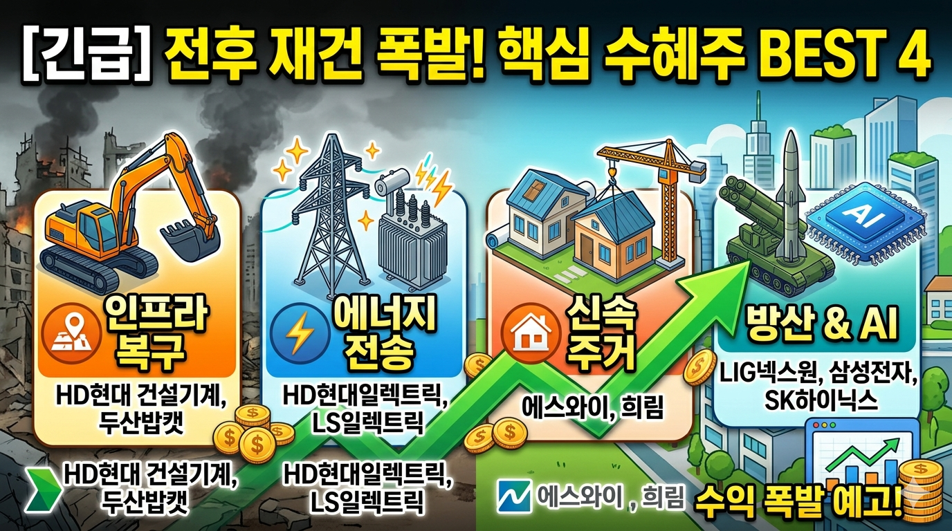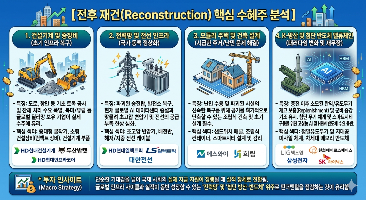 단순한 기대감을 넘어 국제 사회의 실제 자금 지원이 집행될 때 실적 장세로 전환됨. 글로벌 인프라 사이클과 실적이 동반 성장할 수 있는 '전력망' 및 '첨단 방산·반도체' 위주로 펀더멘털을 점검하는 것이 유리함.
