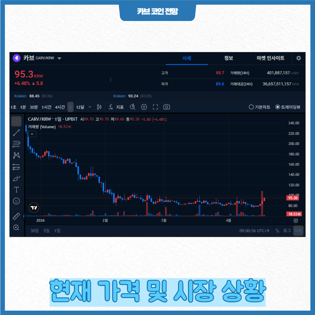 현재 카브 코인은 약 80원~90원대에서 거래되며, 시가총액 기준으로는 아직 중소형 코인에 속합니다.