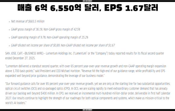 루멘텀은 고성능 광학 및 포토닉 제품, 산업용 레이저 등을 만들고 있다. 초고출력 레이저의 경우 1.6테라바이트를 넘어 3.2테라바이트 급 초고밀도 환경에서는 전력 효율과 발열 제어를 통해 데이터센터 내부 이식까지 성공했다. 최근 주가가 1,500% 이상 폭등한 이유도 위의 이유처럼 AI데이터센터 투자 증가, 엔비디아와 광생태계 연결 기대감, 주문잔고 급증, 실적도 흑자로 돌아섰기 때문이다.