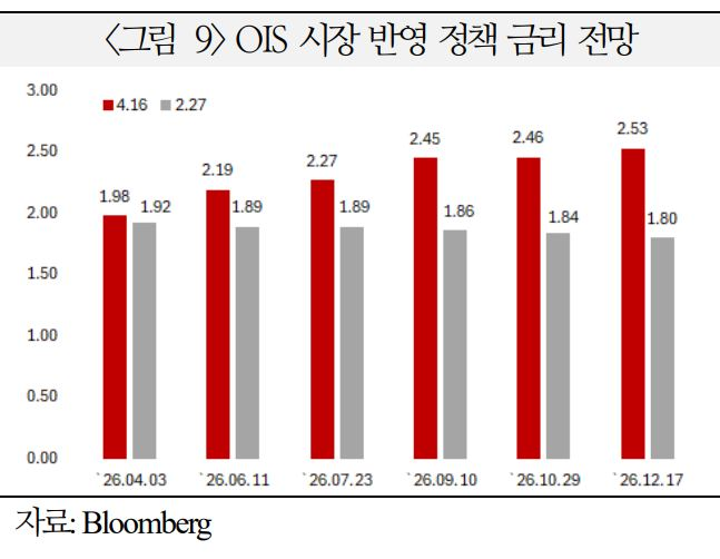 - 스왑시장은 6월 회의까지 정책금리가 인상될 확률을 100% 가까이로 반영하고 있는데 이는 전쟁 이전 금리 인하 기대가 남아있었던 것과 대조적