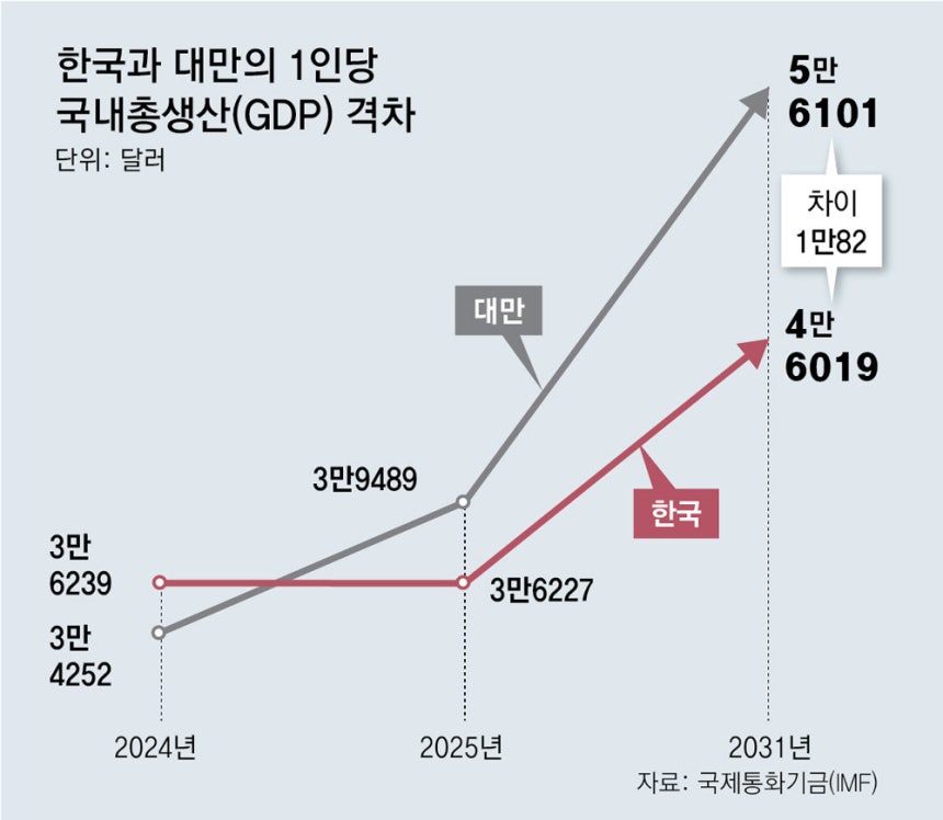 2025년 대만이 22년 만에 처음으로 한국의 1인당 GDP를 추월한 이후, 그 격차는 매년 확대되어 2031년에는 한국이 $40,619, 대만이 $56,101에 도달할 것으로 예상