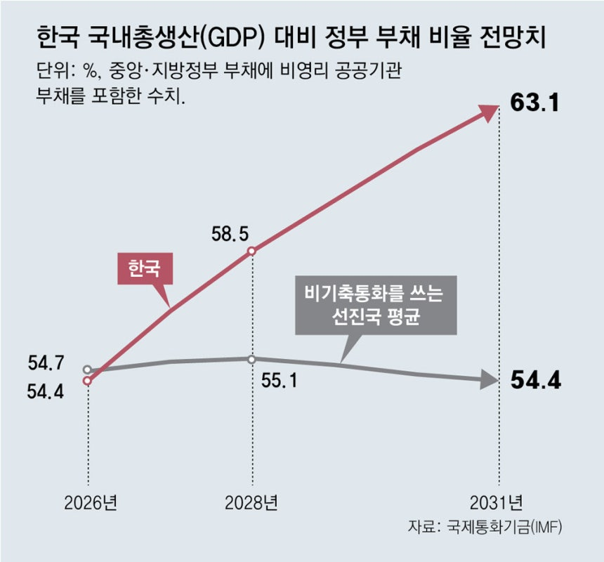 지난해 10월 전망보다 각각 2.3%포인트씩 낮아졌지만, 내년에는 비기축통화를 쓰는 선진국 11곳 평균치(55.0%)를 넘어서게 됨