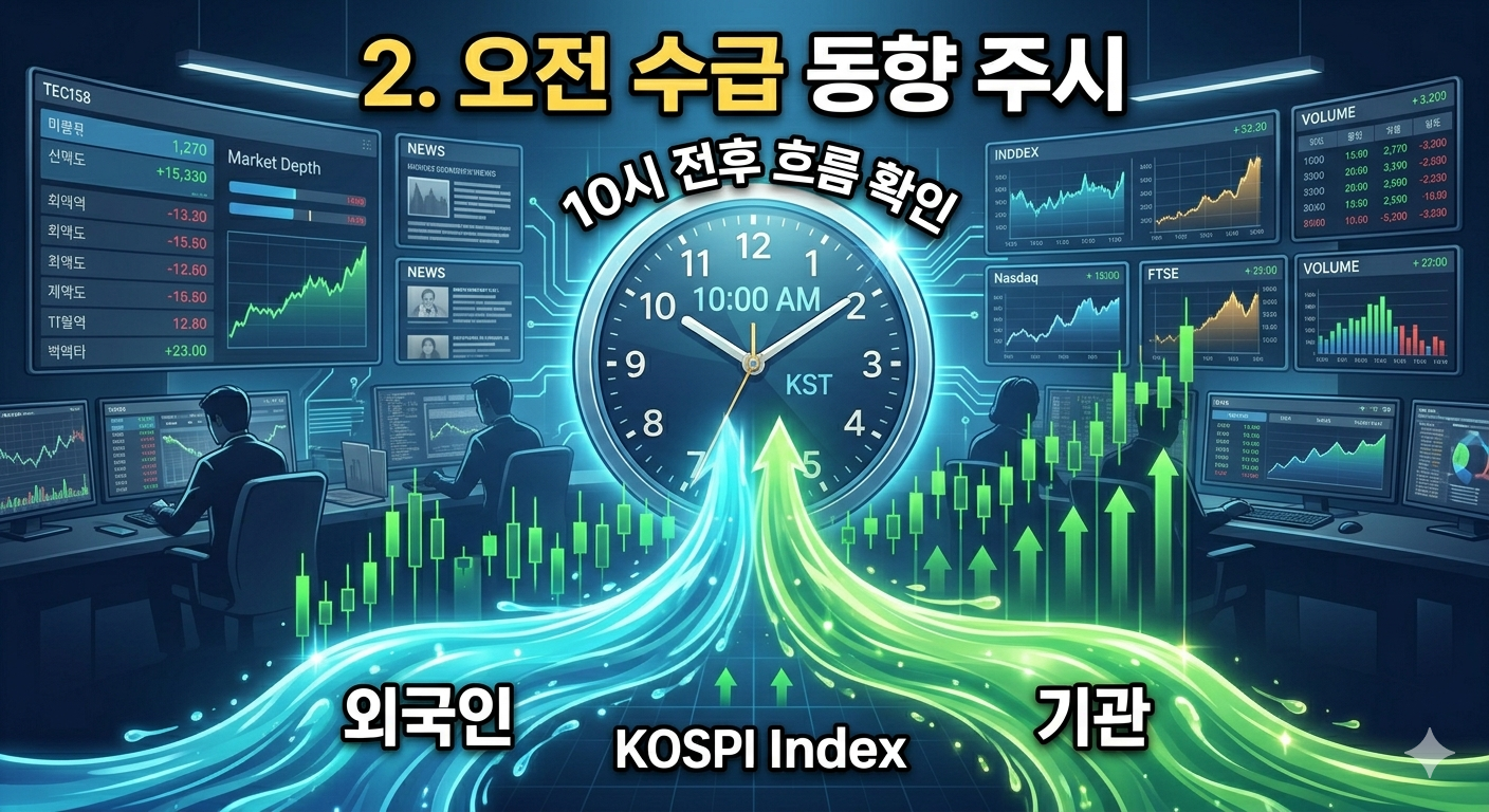 * **수급의 골든타임 대기:** 개장 직후 9시부터 9시 30분 사이의 극심한 변동성 구간에서는 성급한 진입을 피하는 것이 좋습니다. 오전에 쏟아지는 단기 물량이 소화되고, 외국인의 실시간 수급 방향성이 어느 정도 자리 잡는 오전 10시 전후의 흐름을 확인한 뒤 방향을 결정하는 것이 훨씬 안정적입니다.