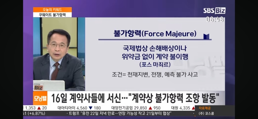 천재지변, 전쟁의 이유로 계약이행 책임을 지지 않아서 특히 우리나라 비상일 수 있어요. 중동에 특히 쿠웨이트로 부터 석유 받지 못하면 상당한 악재입니다. 카타르 LNG는 호주 말레이시아 등으로 대체 수입은 했어요. 그런데 다른 나라 원유는 정유시설 유종에 맞춰서 해야 하기에 정유시설 개조해야 할 수 있습니다. 전쟁으로 인한 후폭풍은 계속 될 것 같아요.