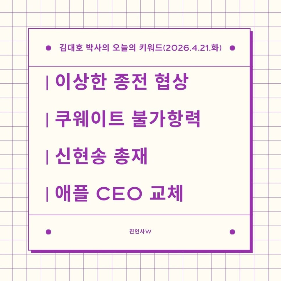 #김대호박사의오늘의키워드 #sbsbiz채널 #경제흐름읽기 #거시경제읽기 #세계주요이슈읽기 #한국경제주요이슈보기 #주식들여다보기 #부동산들여다보기 #시간은소중히쓰자 #이상한종전협상 #쿠웨이트불가항력 #신현송총재 #애플CEO교체
