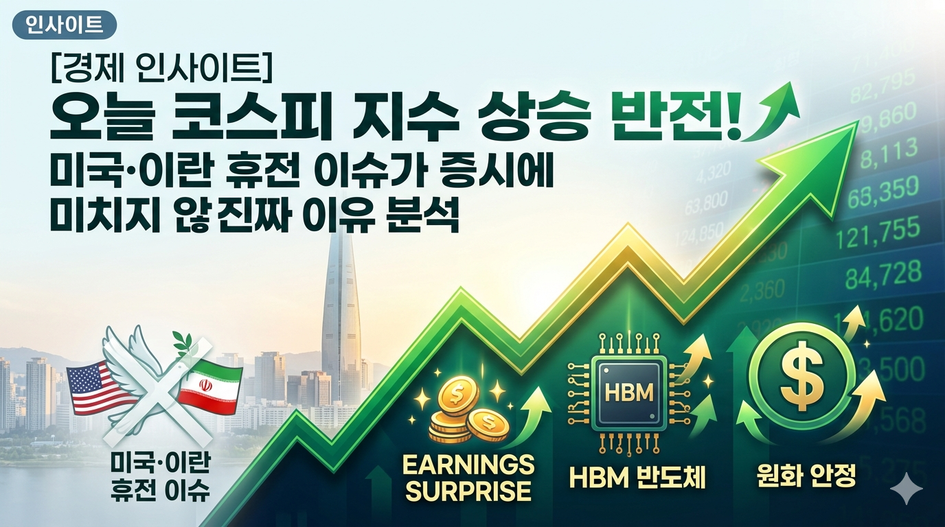 오늘 국내 코스피 지수가 훈풍을 타며 긍정적인 오름세를 보였습니다. 시장 참여자들 사이에서는 최근 글로벌 매크로 환경에서 가장 큰 화두였던 '미국과 이란의 휴전 이슈'가 생각보다 우리 증시에 폭발적인 상승 동력으로 작용하지 않고 있다는 점에 주목하고 있습니다.