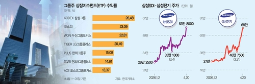 삼성전자(005930)의 1분기 역대급 실적 속에 삼성전기(009150)와 삼성SDI(006400)에 대한 재평가가 더해지면서 삼성그룹주 상장지수펀드(ETF) 수익률이 빠르게 치솟고 있음
