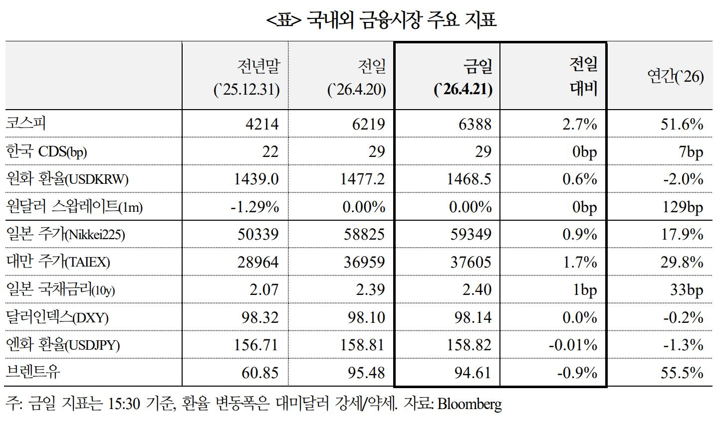 이에 ‘국내 코스피 사상 최고치, 중동 전쟁에 대한 국내외 금융시장 동향(4.21)’ 관련하여 국제금융센터 보고서를 통해 좀 더 자세히 알아보도록 하겠습니다.