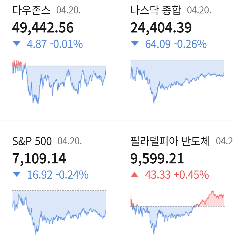다우 지수는 전일대비 -0.01% 하락한 49,442.56에 거래를 마쳤으며, 대형주 중심의 S&P500 지수는 전장대비 -0.24% 떨어진 7,109.14에 장을 마감하였습니다. 기술주 중심의 나스닥 지수는 전 거래일 대비 -0.26% 하락한 24,404.39에 거래를 마치며 장을 마감하였습니다.