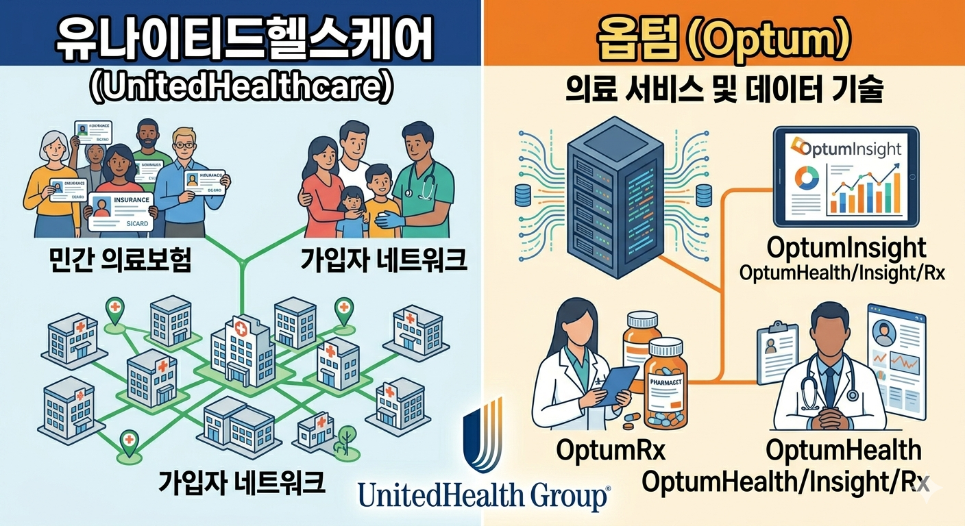* **옵텀(Optum):** 회사의 강력한 성장 동력을 담당하는 **의료 서비스 및 데이터 기술 부문**입니다. 환자 진료 네트워크 제공(OptumHealth), 데이터 분석 및 헬스케어 IT 솔루션(OptumInsight), 약국 혜택 관리(PBM, OptumRx) 등 보험을 넘어선 헬스케어 산업 전반의 시스템을 장악하고 있습니다.
