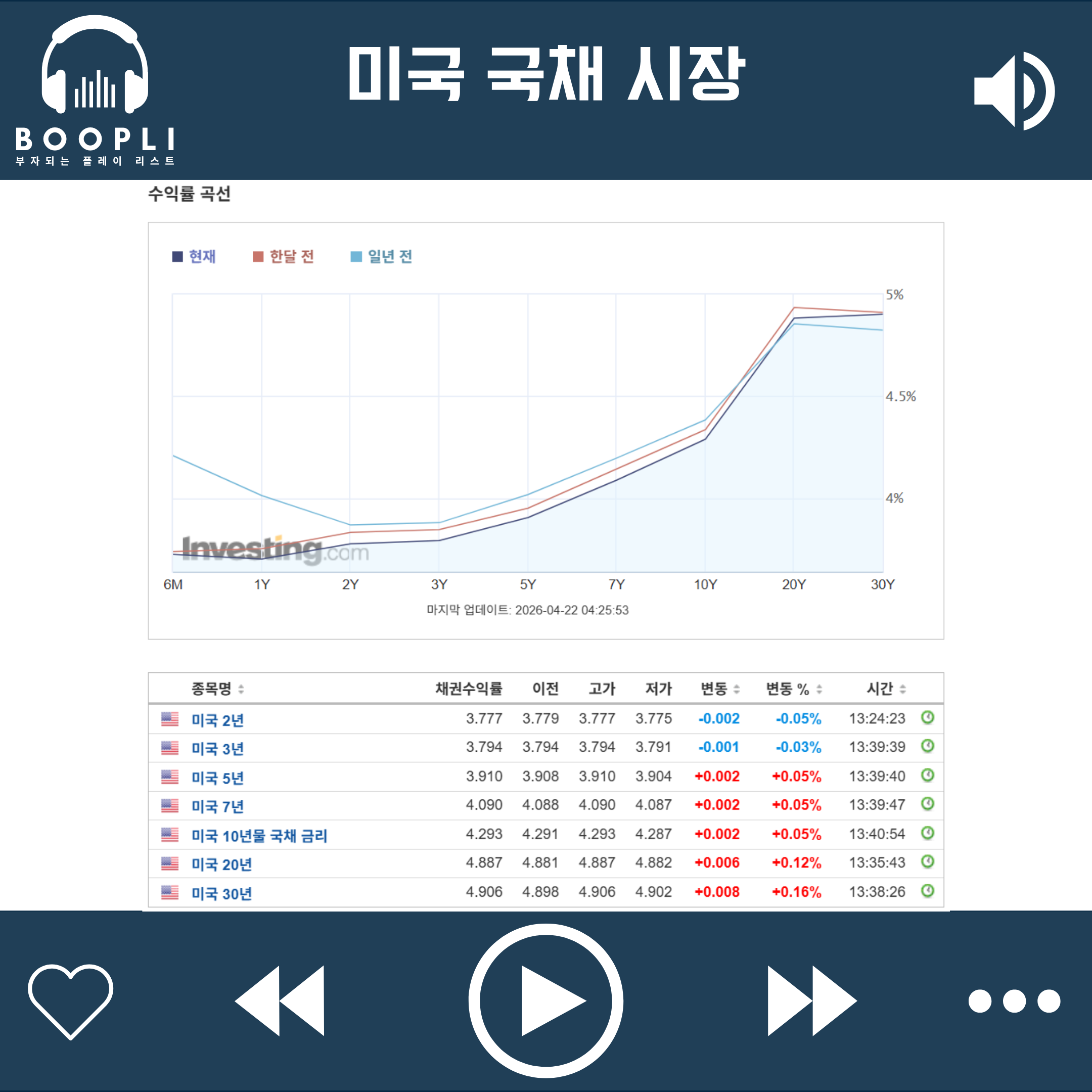 미국 국채는 3월 소매판매 지표가 견조한 가운데, 미·이란 휴전 협상 교착으로 국제 유가가 상승하고 케빈 워시 연준 의장 후보자의 매파적 발언이 더해지며 장단기 금리 모두 상승