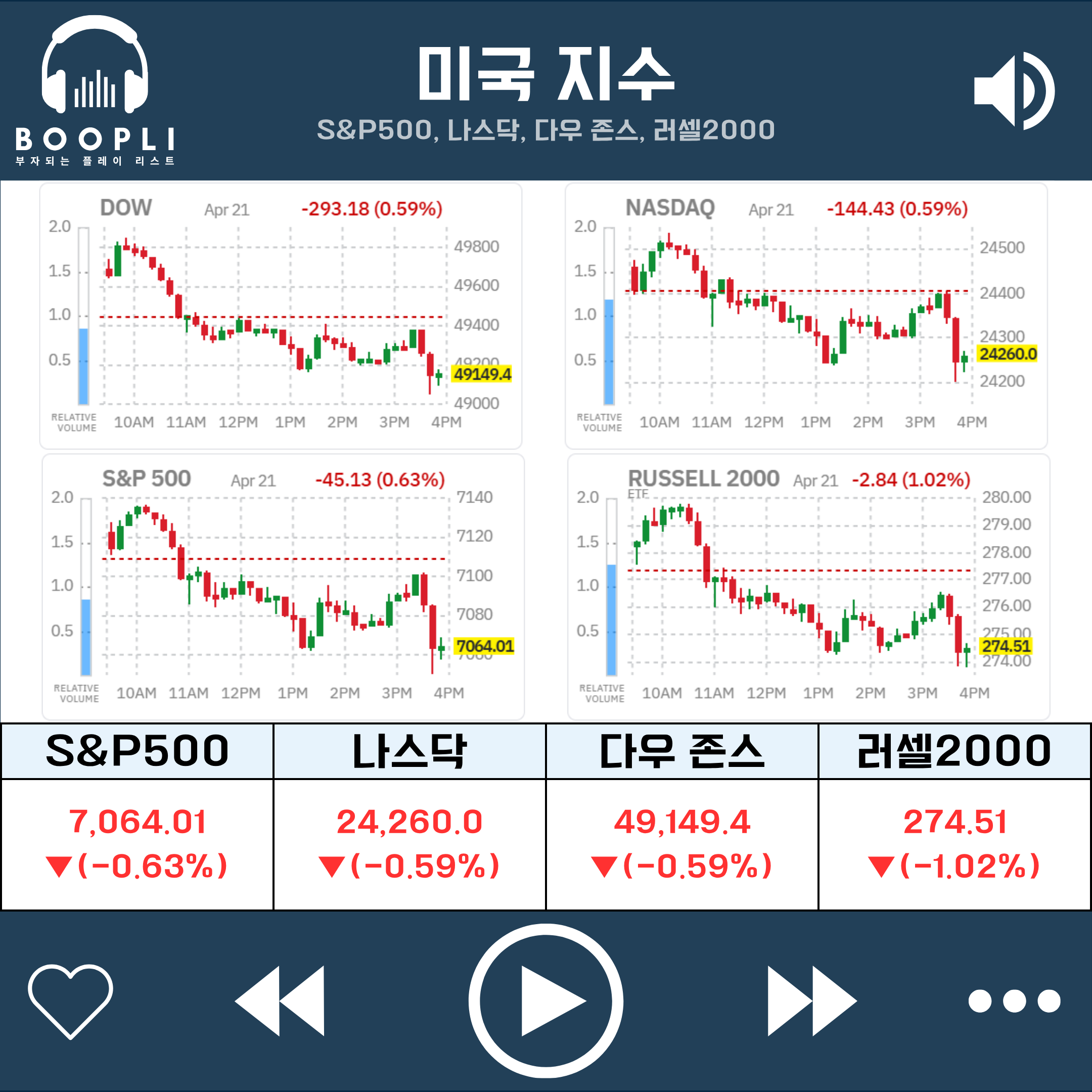 그러나 이란 타스님 통신이 이란 협상단의 추가 협상 불참을 보도하고, 악시오스도 밴스 부통령의 파키스탄행이 무기한 연기됐다고 전하면서 협상 결렬 우려가 급격히 고조되자, 결국 주요 지수는 장중 저점을 경신하며 하락 마감