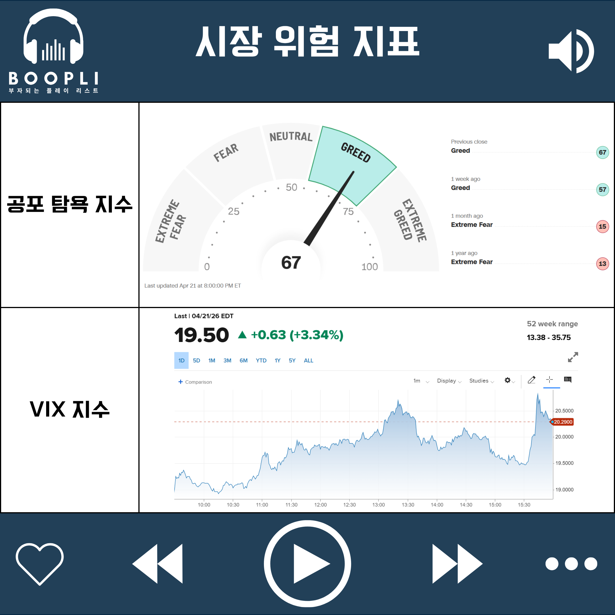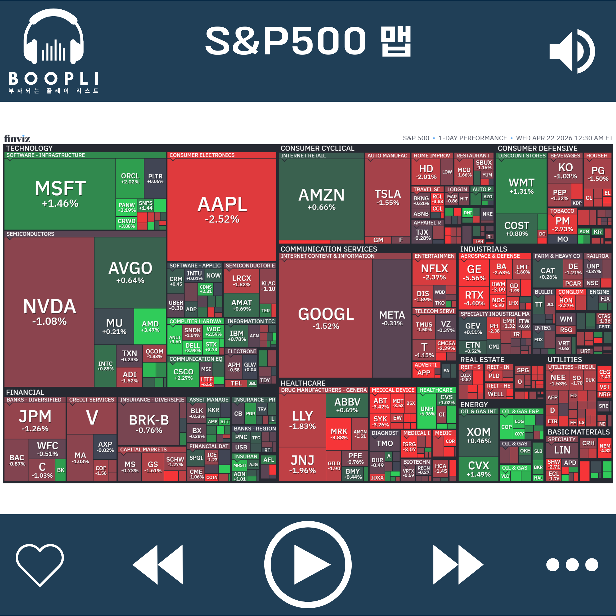 반면 RTX, 노스롭그루먼 등 방산주는 호실적에도 불구하고 중동 확전 우려 완화와 차익 실현 매물에 하락했고, 애플은 CEO 교체 소식에 약세를 보이며 지수 상단을 제한