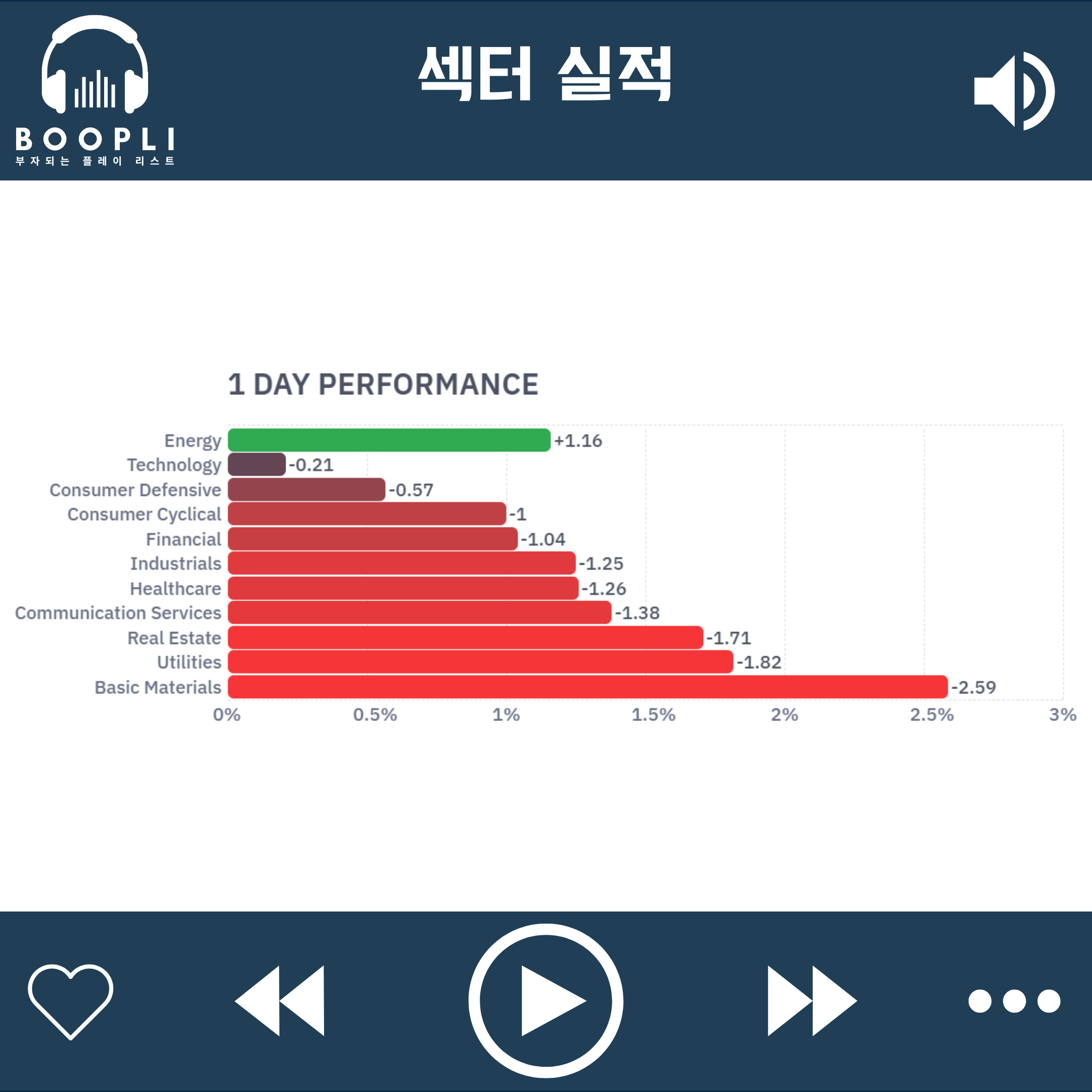 국채 금리가 상승하면서 원자재 섹터가 하락을 주도했고, 이어서 유틸리티, 부동산, 커뮤니케이션 서비스, 헬스케어, 산업재, 금융, 소비 순환재, 경기 방어주 순으로 약세