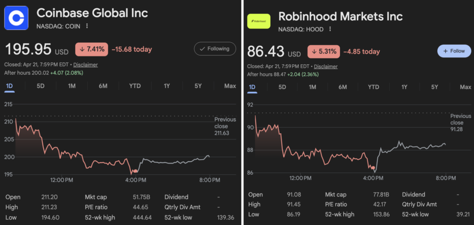 상황이 이렇다 보니 가상자산 관련 주식들도 힘을 쓰지 못했습니다. 미국의 대표적인 거래소인 코인베이스(Coinbase)는 6% 넘게 급락했고, 개인 투자자들이 많이 이용하는 로빈후드(Robinhood) 역시 4.5% 정도 하락했습니다.