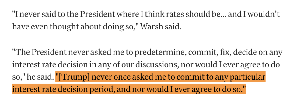 가장 이슈가 된 것은 차기 미국 연방준비제도(Fed) 의장으로 지명된 케빈 워시의 상원 청문회였습니다. 사실 시장에서는 트럼프 대통령이 평소 금리 인하를 강하게 요구해온 만큼, 워시 지명자가 취임하자마자 시원하게 금리를 내려줄 것이라는 기대가 컸었죠. 하지만 워시 지명자는 청문회에서 연준의 '독립성'을 유독 강조하며 예상보다 신중한 태도를 보였습니다.