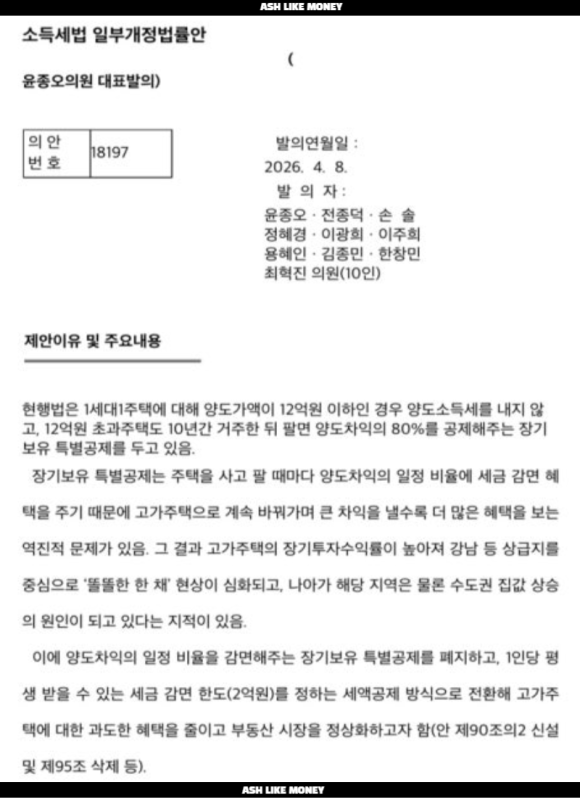 이번에 장기보유특별공제를 폐지한다는 내용의 소득세법 일부개정법이 법안으로 발의되었다. 발의된 개정안에선 장기보유특별공제를 폐지하며 1인당 생애 평생 최대 양도세 감면혜택을 2억으로 제한한다는 것이다. 장기보유특별공제는 아파트를 매수하고 보유기간이 3년 이상인 토지나 부동산에 대해 양도소득금액을 산정할 때 비율에 따라 양도소득세를 계산하는 제도이다. 보통 1가구 1주택에 대한 양도차익이 12억 이하인 경우 양도세는 비과세이다.
