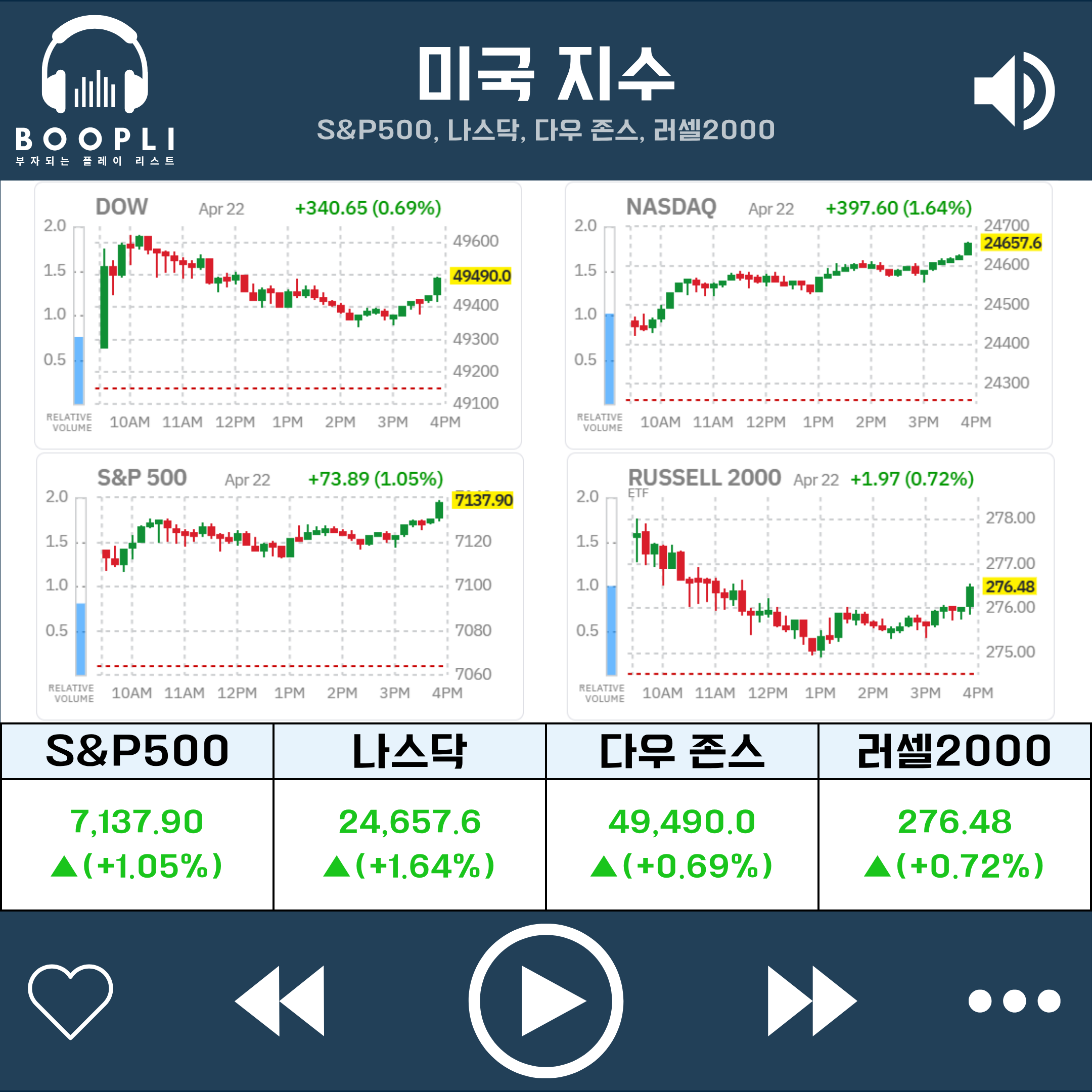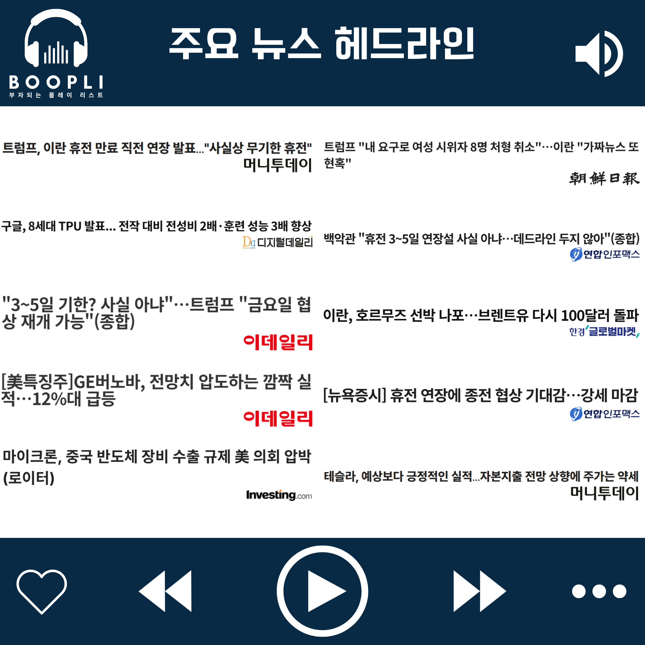 개장 전에는 트럼프 대통령이 이란과의 휴전 만료 직전 사실상 무기한 휴전을 전격 발표하며 지정학적 리스크가 완화됐고, 위험자산 선호 심리가 개선됨