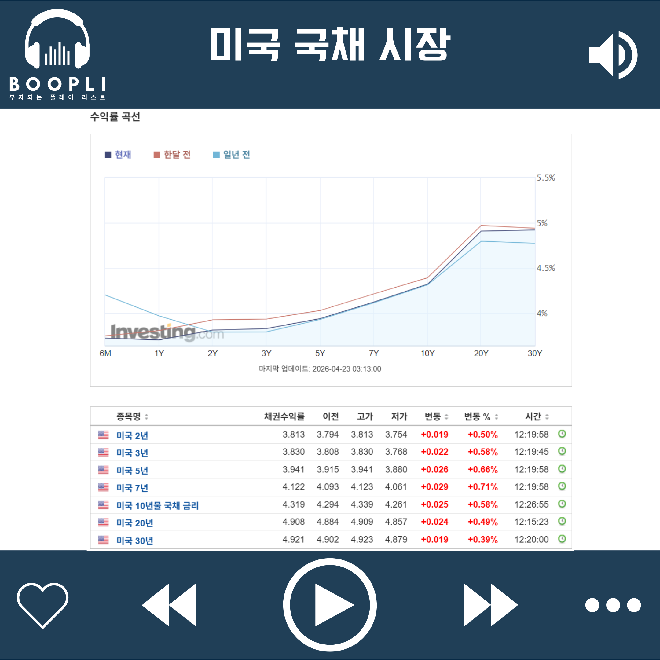 미국 국채는 트럼프 대통령의 무기한 휴전 연장과 20년물 국채 입찰 호조에도 불구하고 이란의 호르무즈 해협 선박 나포와 휘발유 재고 감소로 국제 유가가 상승하며 단기 금리를 중심으로 상승