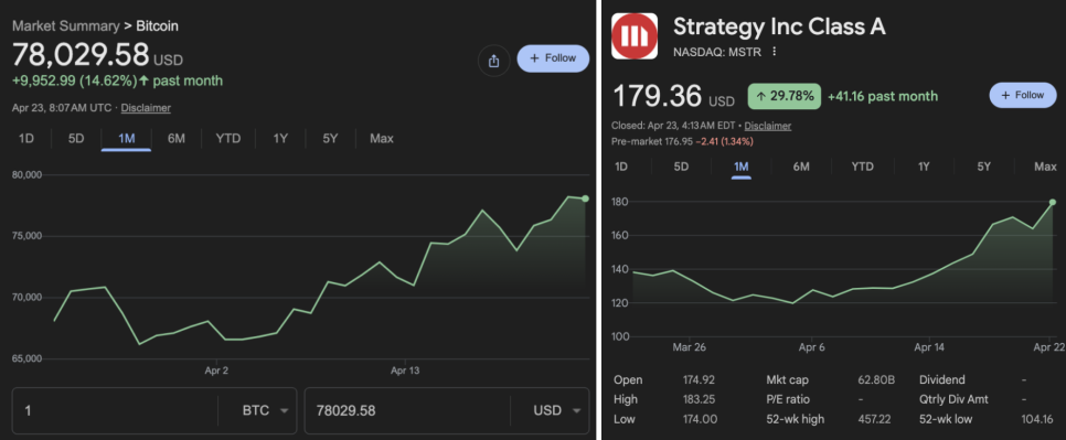 오히려 이웃집 스트래티지(MSTR)가 지난 한 달 동안 30% 가까이 상승하며 상당한 상승세를 보여줬는데요. 비트코인 역시 14% 이상 상승했습니다.