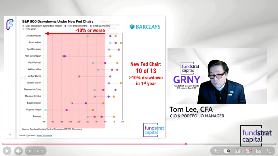 차기 연방준비제도 의장 후보인 케빈 워시(Kevin Warsh)의 인준 절차는 이번 주에 시작됩니다. 과거 사례를 비추어 볼 때, 청문회와 투표 과정을 거쳐 실제 취임까지는 대략 6월에서 7월 정도가 걸릴 것으로 보입니다. 톰리에 따르면 역대 13명의 연준 의장 중 10명이 취임 첫해에 주가가 10% 이상 하락하는 조정을 경험했다고 합니다.