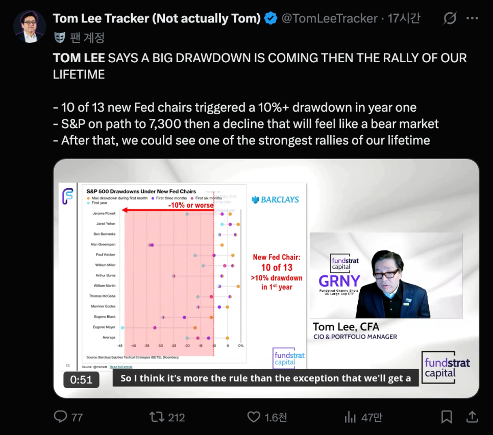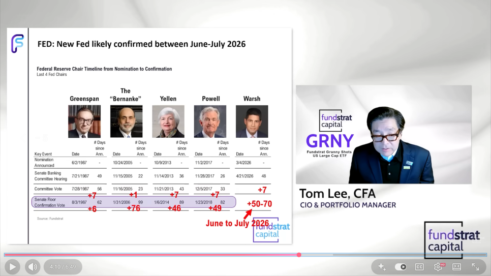 물론 앞으로의 길이 순탄하기만 한 것은 아닙니다. 톰 리는 곧 새로운 연준 의장이 임명되면서 시장이 새로운 수장을 시험하려 들 것이고, 이 과정에서 어느 정도의 혼란과 변동성은 피할 수 없을 것이라고 내다봤습니다.