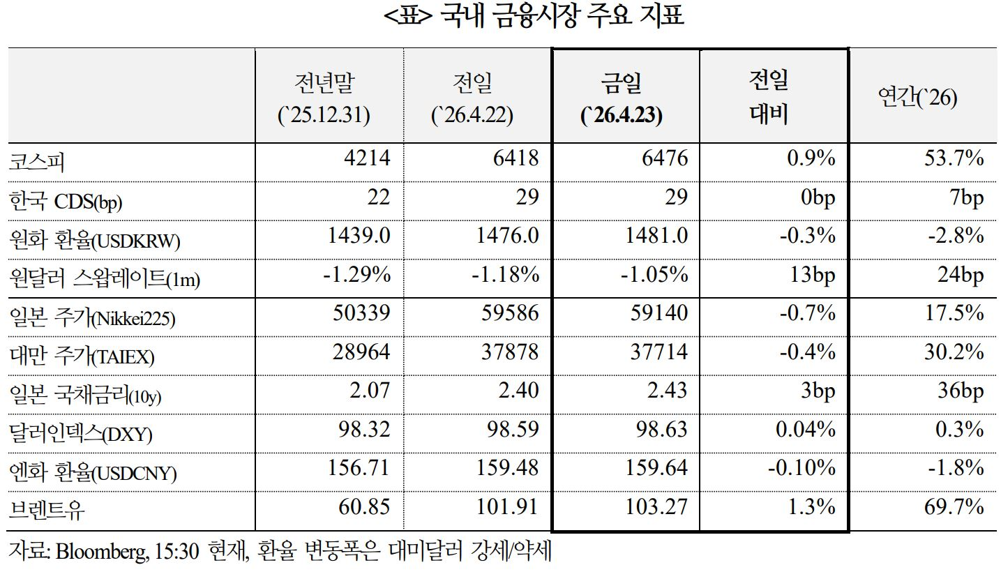 금일 주가는 SK하이닉스 호실적 등으로 개인 매수세가 유입되며 상승한 반면, 국채는 GDP 서프라이즈 및 외국인 매도세로 약세. 환율은 미-이란 협상 불발에 따른 유가 반등·强달러 압력으로 상승(KOSPI +0.9%, 국고채 3년 +9bp, 원/달러 +5.0원)