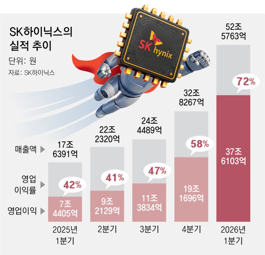SK하이닉스가 올 1분기(1∼3월) 매출 52조5763억 원, 영업이익 37조6103억 원이라는 ‘역대급’ 실적을 내놨음