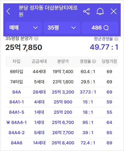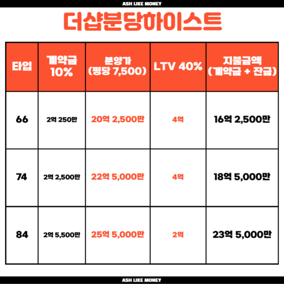 분양하는 일반분양 세대수는 143세대이며 계약금 10%이며 LTV 40%, 중도금 대출도 40%이다. 더샵분당티에르원이 평당 7천만원 이상으로 84타입이 26억 8,400만원이었지만 결국 사후접수 끝에 완판되었다. 그래서 더샵분당티에르원과 비슷한 분양가로 예상되어 평당 7천만원 이상일 것으로 본다. 분양가에 시세차익은 어렵지만, 향후 선도지구 재건축으로 신축이 30억 이상이 된다면 시세차익은 4억~5억 수준이다.