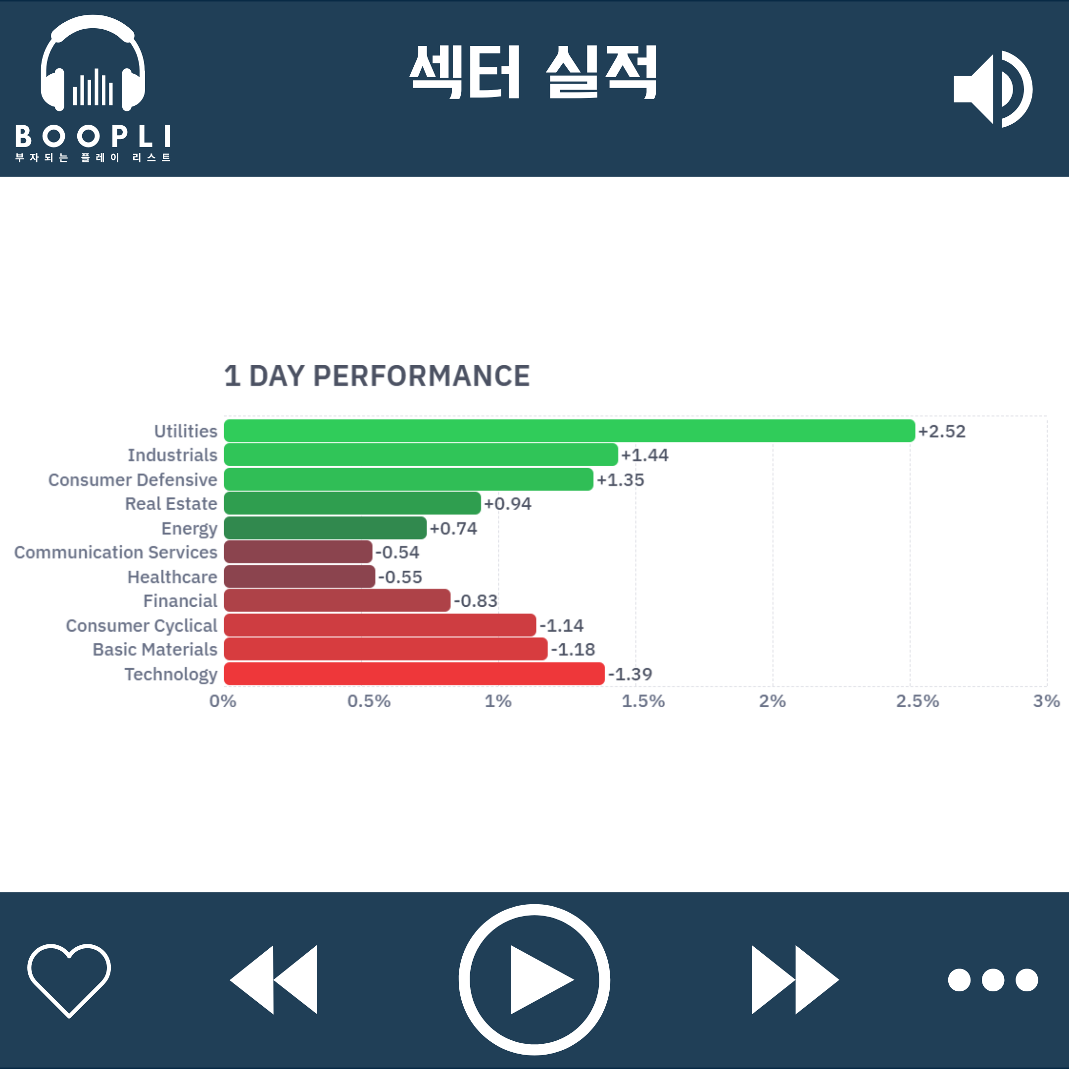 유틸리티 섹터가 상승을 주도했고, 이어서 산업재, 경기 방어주, 부동산, 에너지 순으로 강세
