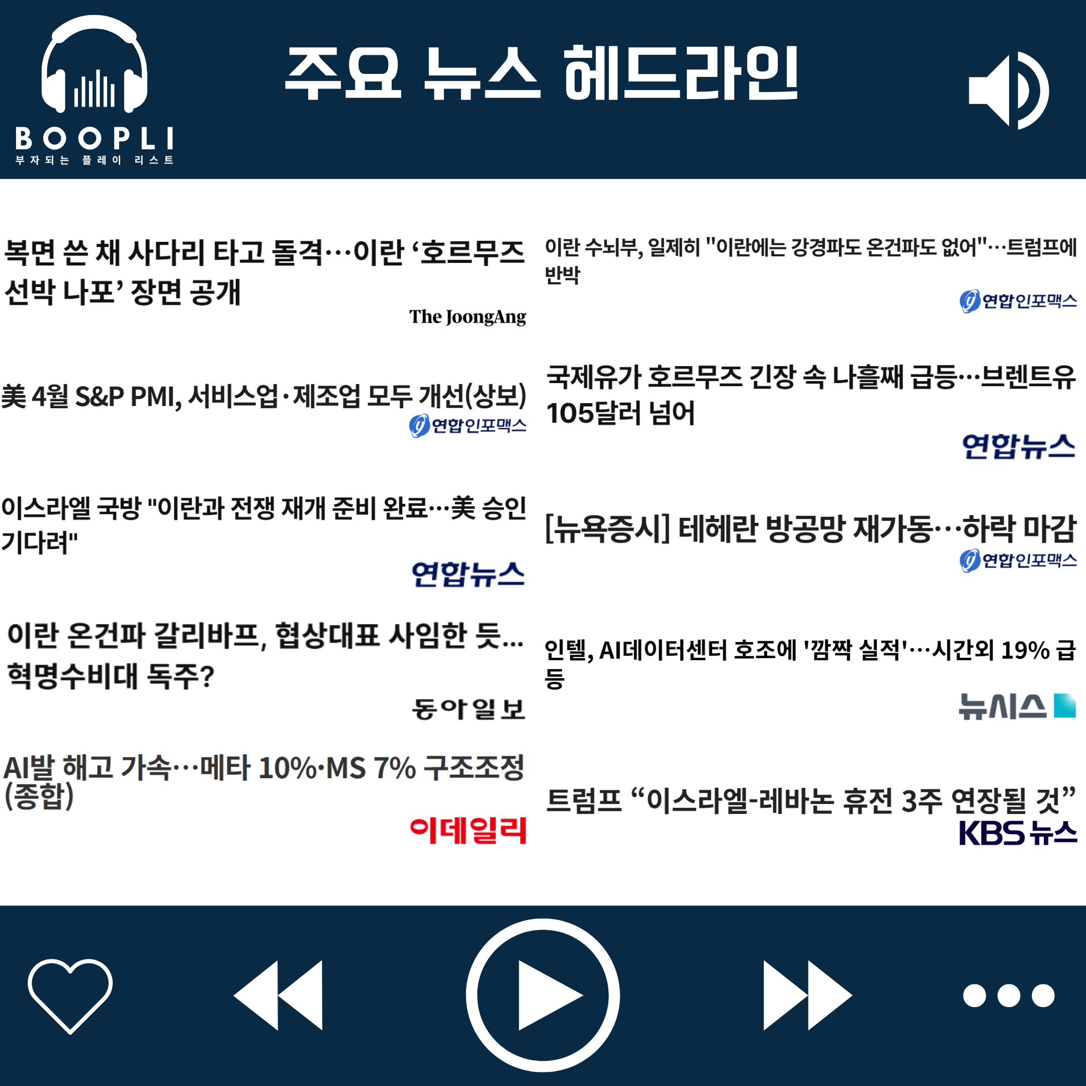 장중에는 저가 매수세가 유입되며 반등을 시도했으나, 이스라엘 카츠 국방장관이 "미국 승인 시 이란과의 전쟁을 재개할 준비가 돼 있다"고 발언하고 테헤란 일부 지역에서 방공망이 재가동됐다는 소식이 전해지며 군사적 긴장이 재차 고조돼 지수는 다시 하락 전환