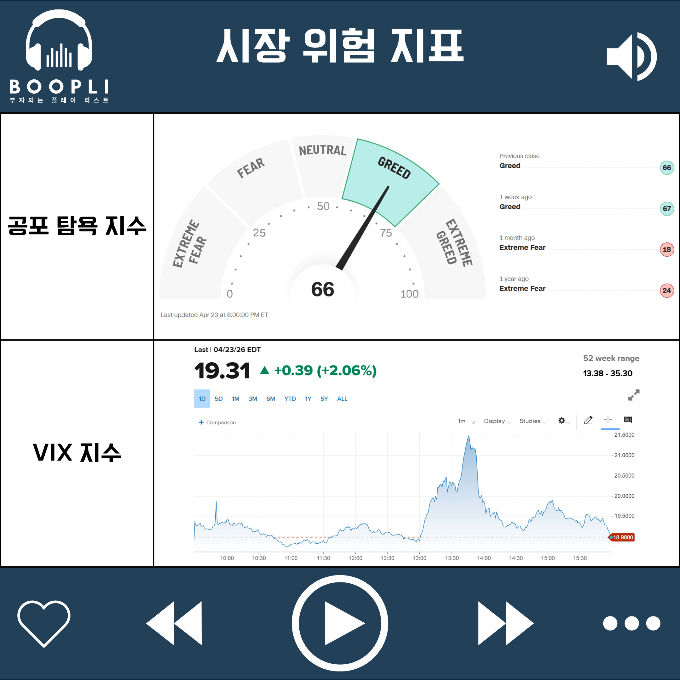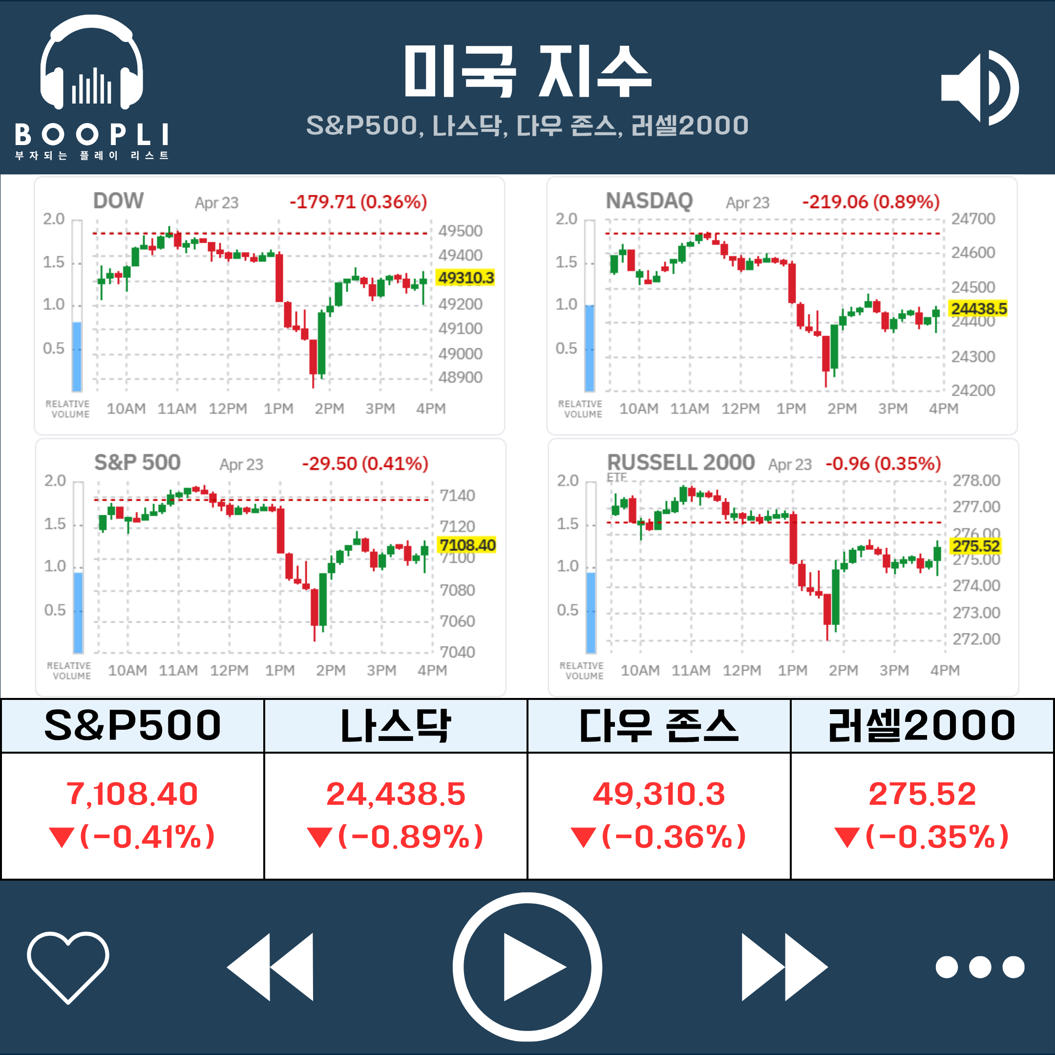 경제 지표는 주간 신규 실업수당청구건수가 예상치를 상회했으나, 낮은 수준을 유지하며 고용의 견조함을 나타냈고, 4월 S&P 구매관리자지수(PMI) 예비치는 제조업과 서비스업 모두 예상치를 상회했으나, 투입 비용 인플레이션이 11개월 만에 최고 수준을 기록하며 물가 상승 압력에 대한 부담이 부각됨
