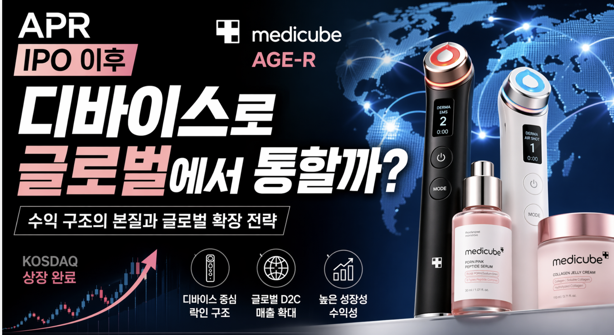 많은 분들이 APR을 여전히 화장품 회사로 이해하고 있지만, 이 기업을 제대로 보려면 출발점을 바꿔야 합니다. 이 회사는 스킨케어를 파는 기업이 아니라, 디바이스를 통해 고객을 확보하고 그 위에 반복 소비 구조를 얹는 방식으로 돈을 만드는 기업이고, 이 구조가 만들어내는 매출의 질과 성장 속도가 기존 K-뷰티 기업들과는 완전히 다른 궤적을 그리고 있습니다. 특히 최근 IPO를 통해 시장의 검증을 받으면서, 이제는 단순히 “잘 되는 브랜드”가 아니라 “글로벌로 확장 가능한 구조인가”라는 질문을 받고 있는 단계로 넘어갔다는 점에서 지금이 가장 중요한 시점이라고 볼 수 있습니다.