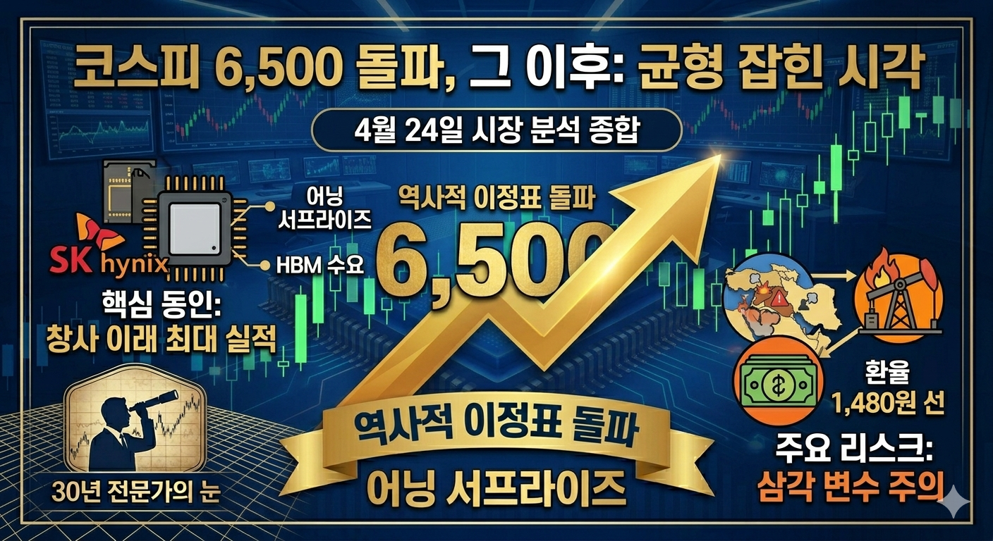 코스피 지수는 4월 24일 6,481.33에 마감하며 전고점 수준을 유지하는 데 성공했다. 전일인 23일 장중 사상 최초로 6,500선을 돌파한 이후, 24일 시장은 역사적 이정표 달성에 따른 차익 실현 심리와 외부 불확실성이 맞물리며 좁은 박스권 등락을 이어갔다. 하락 출발에도 불구하고 장 후반 낙폭을 대부분 만회하며 보합권에서 마무리했다는 점은, 현 시장의 저변에 강한 매수 에너지가 여전히 살아 있음을 방증한다.