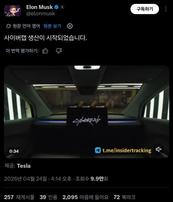 일론 머스크는 오늘(24일) 오전, 사이버캡 생산 시작(Cybercab production starts now)이라는 트윗을 올렸습니다.