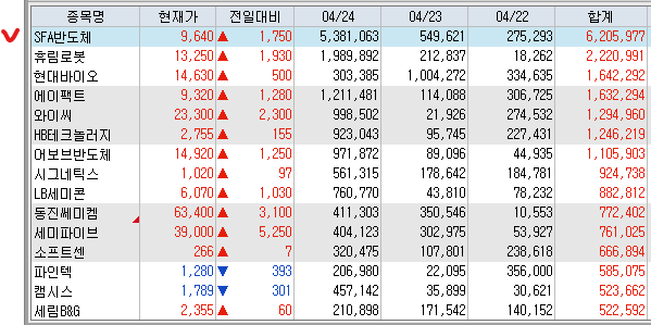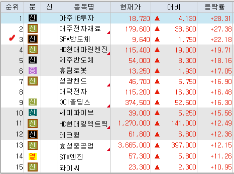삼성전자-SK하이닉스 설비투자 확대 기대감에 반도체 소부장주가 상승(SFA반도체 +22.18%, 제주반도체 +18.16%, 대덕전자 +16.48%, 테크윙 +12.36%, LX세미콘 +10.20%, DB하이텍 +8.59%, PS일렉트로닉 +7.67%, 피에스케이 +6.77%, 주성엔지니어링 +6.63%, 하나마이크론 +6.05%, 심텍 +5.67%, HPSP +4.71%)