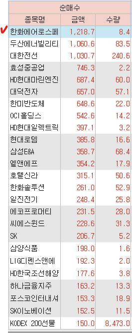 KOSPI에서 외국인은 -2조1,245억 원을 순매도, 기관은 +5,370억 원을 순매수. KOSDAQ에서는 외국인과 기관 모두 각각 +8,103억 원, +1,787억 원 순매수. 외국인은 코스피를 팔고 코스닥을 사는 트레이딩을 했음. 외국인은 KOSPI에서 기계/장비와 화학 업종을 매수했고, 운송장비/부품과 전기/전자 업종을 매도