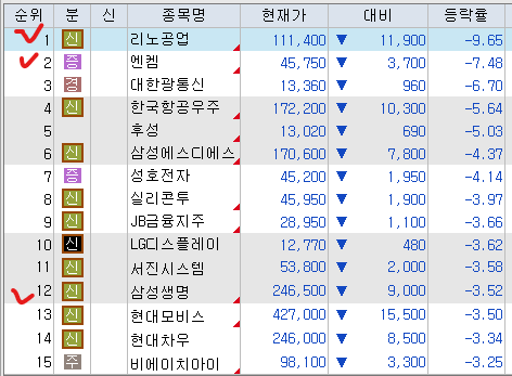 반면, 실적 발표 이후 상승했던 삼성전자에서 차익 실현 매물이 출회되면서 하락. 그 외 자동차주가 내렸음