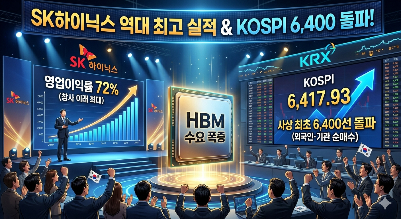 SK하이닉스가 2026년 1분기 영업이익률 72%라는 경이로운 성과를 달성하며 창사 이래 최대 실적을 경신했다. AI 서버 수요 폭증에 따른 HBM(고대역폭메모리) 판매 급증과 메모리 단가 상승이 결정적 요인으로 작용했다. 이 호실적 발표가 촉매제가 되어 4월 23일 코스피 지수가 사상 처음으로 6,400선(6,417.93)을 돌파하는 역사적 기록을 세웠다. 외국인·기관 투자자의 대규모 순매수가 지수를 끌어올렸으며, 현대자동차도 1분기 매출 46조 원 달성 소식을 전하며 시장 훈풍에 기여했다.