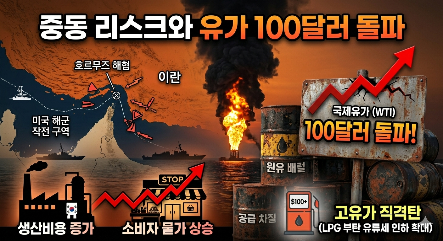 호르무즈 해협을 둘러싼 미·이란 간 군사적 긴장 고조로 국제유가가 배럴당 100달러를 돌파했다. 한국은 원유 수입 의존도가 높은 구조상 고유가의 직격탄을 맞기 쉬운 경제 체질을 갖고 있다. 정부는 LPG 부탄 연료에 대한 유류세 인하율을 기존 10%에서 25%로 확대하는 조치를 시행하며 서민 물가 방어에 나섰지만, 이는 어디까지나 단기 처방이라는 평가가 지배적이다.