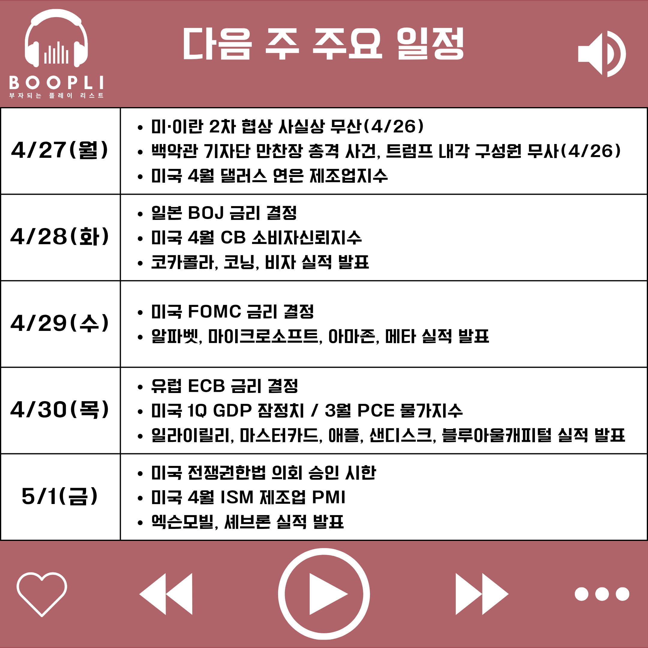 경제 지표는 1분기 GDP 잠정치와 3월 PCE 물가지수가 이번 주 핵심 지표로, 미국 경기 흐름과 인플레이션 경로를 가늠하는 데 있어 시장의 주목도가 높을 것으로 예상된다.