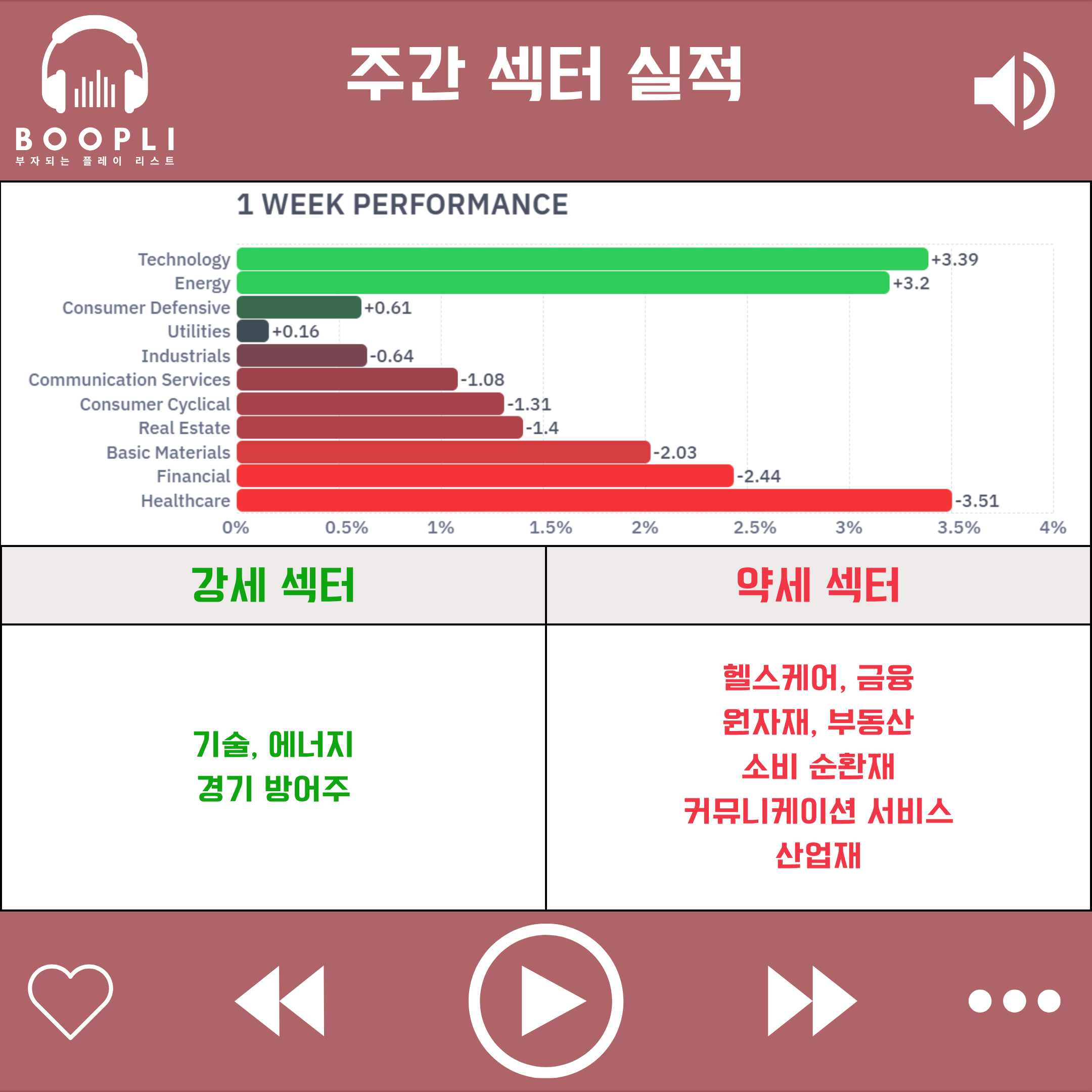 이번 주에는 이란의 호르무즈 해협 재봉쇄와 미·이란 협상 불확실성 속에서 기술주와 에너지 섹터가 상승을 주도하고, 이어서 경기 방어주도 강세를 보였다.