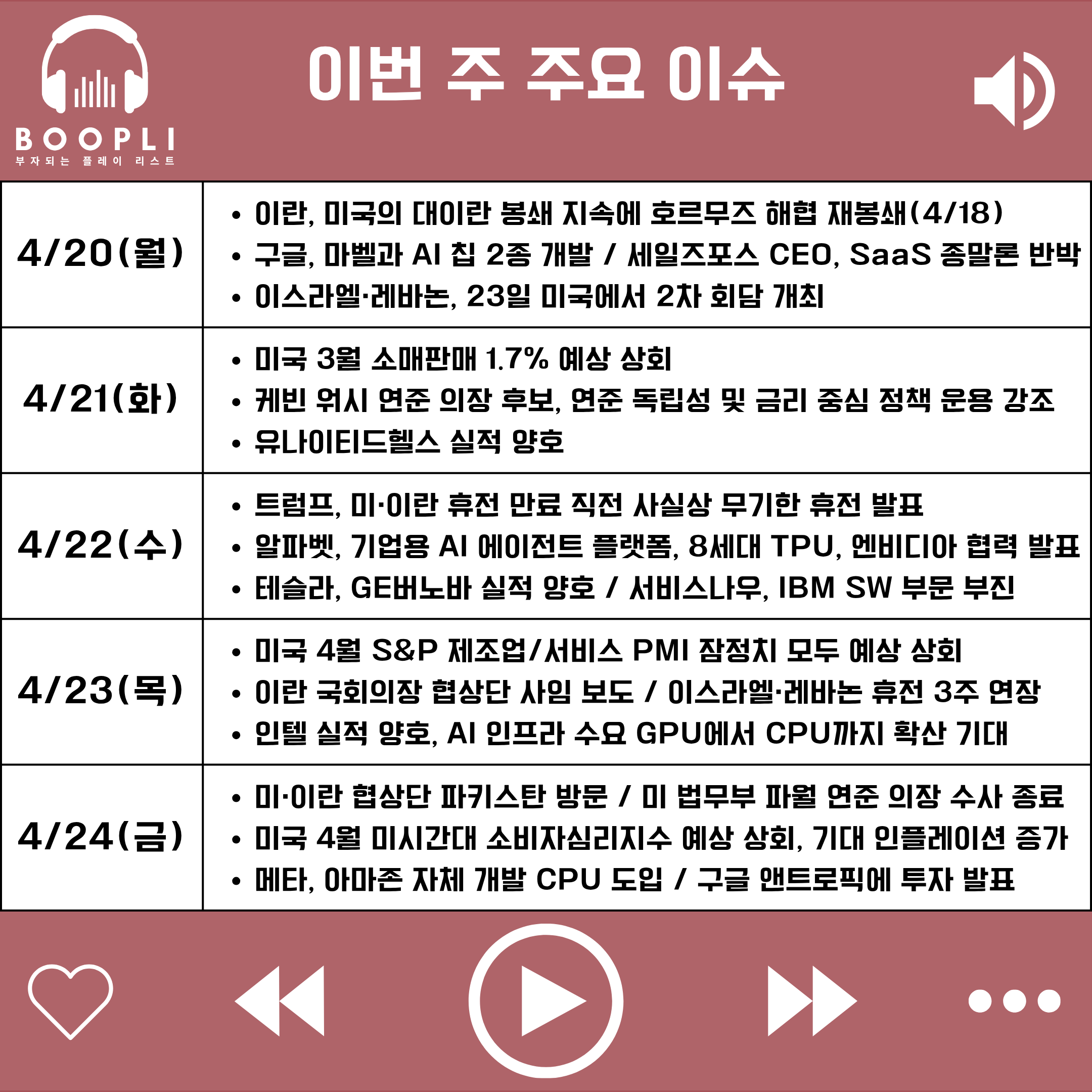 주 중반에는 트럼프 대통령이 휴전 만료 직전 사실상 무기한 휴전을 발표하며 지정학적 불안이 완화된 가운데, 알파벳의 AI 에이전트 플랫폼 및 8세대 TPU 공개와 엔비디아와의 협력, GE버노바의 호실적 등이 맞물리며 투자심리가 빠르게 회복됐고, 나스닥과 S&P500은 사상 최고치를 경신했다.