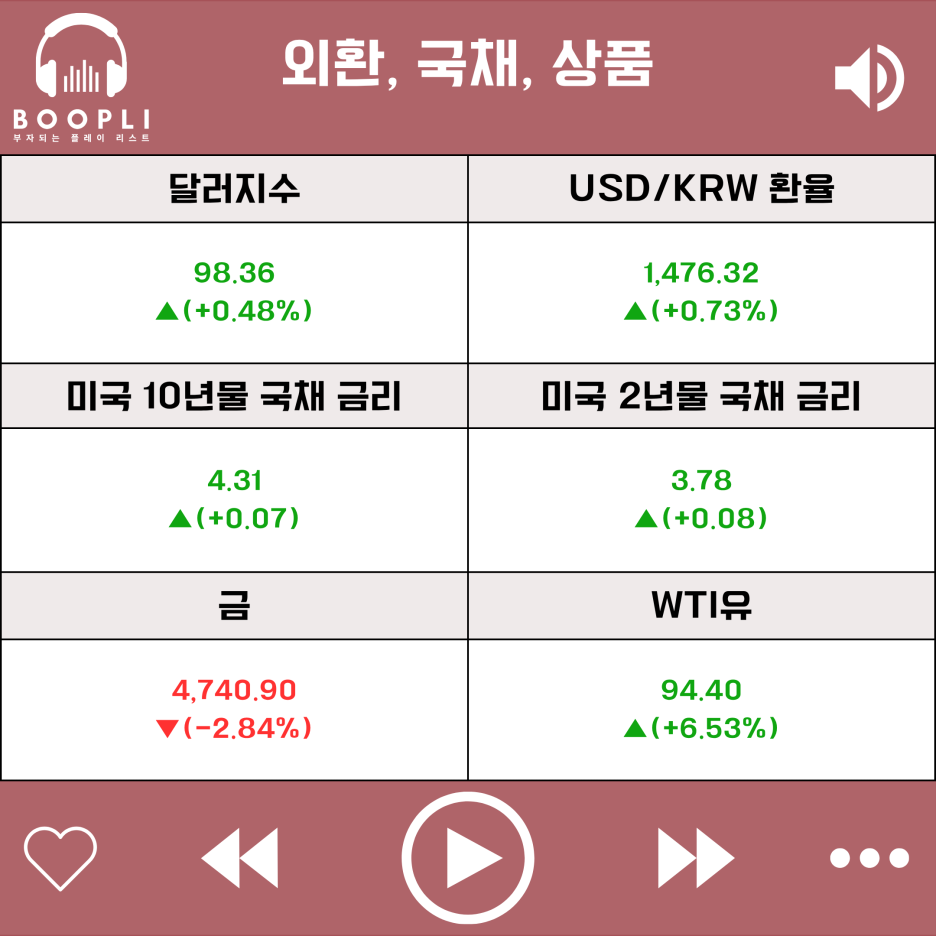 국채 금리 상승으로 금 가격은 하락했고, 이란의 호르무즈 해협 재봉쇄와 협상 불확실성 속에 국제 유가인 WTI유 가격은 상승했다.