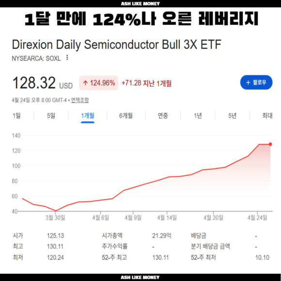 SOXL의 최근 종가는 128.32달러로 하루 상승률이 13.79%란 엄청난 상승을 보였다. 3배 레버리지인 만큼 필라델피아 반도체 지수가 오르면 오를수록 상승률은 엄청나다. 연속 17일 거래일이나 상승한 SOXL은 32년 만에 역사상 최장 기록을 기록했다. 이 정도면 과열권이라 보는 시각도 많아 추격매수보다는 어느 정도 조정이 오길 기다리는 투자자들도 있다.